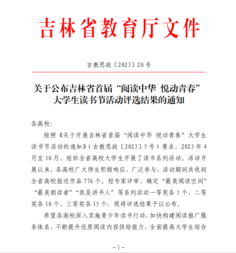 近日,由吉林省教育厅主办的吉林省首届“阅读中华 悦动青春”大学生读书节活动评选结果公布。活动开展以来,各高校广大师生积极响应、广泛参与,活动期间共收到全省高校报送作品776个。经专家评审,确定“最美阅读空间”“最美朗读者”“我是讲书人”等系列活动一等奖各 5 个、二等奖各 10 个、三等奖各 15 个。长春建筑学院图书馆策划组织读者参加“最美阅读空间”和“最美朗读者”两个系列活动,聂欣宇、张志宾两名学生的参赛作品分别获得二等奖。